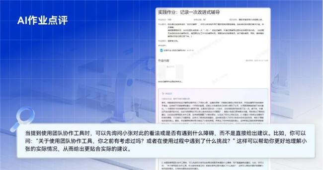 对于工作分派、目标拆解等管理情景作业,若要实现全员的精细化辅导,传统人工模式的时间与人力成本极高。而AI能对齐专家标准,实现秒级反馈,既点亮点,又抓漏洞。
