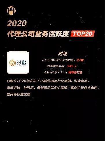 在斩获广告门年度盘点的榜单外,喜报连连而来!广告门指数近日还发布了「2020代理公司年度榜单」。时趣继入选2019年终榜TOP2、2020年中榜TOP2之后,再次荣膺「2020广告门指数年度榜单-代理公司榜单」第二名的佳绩,并凭借丰富的品牌合作案例与优质内容,入选了广告门「2020业务活跃度TOP20」榜单且名列前茅。